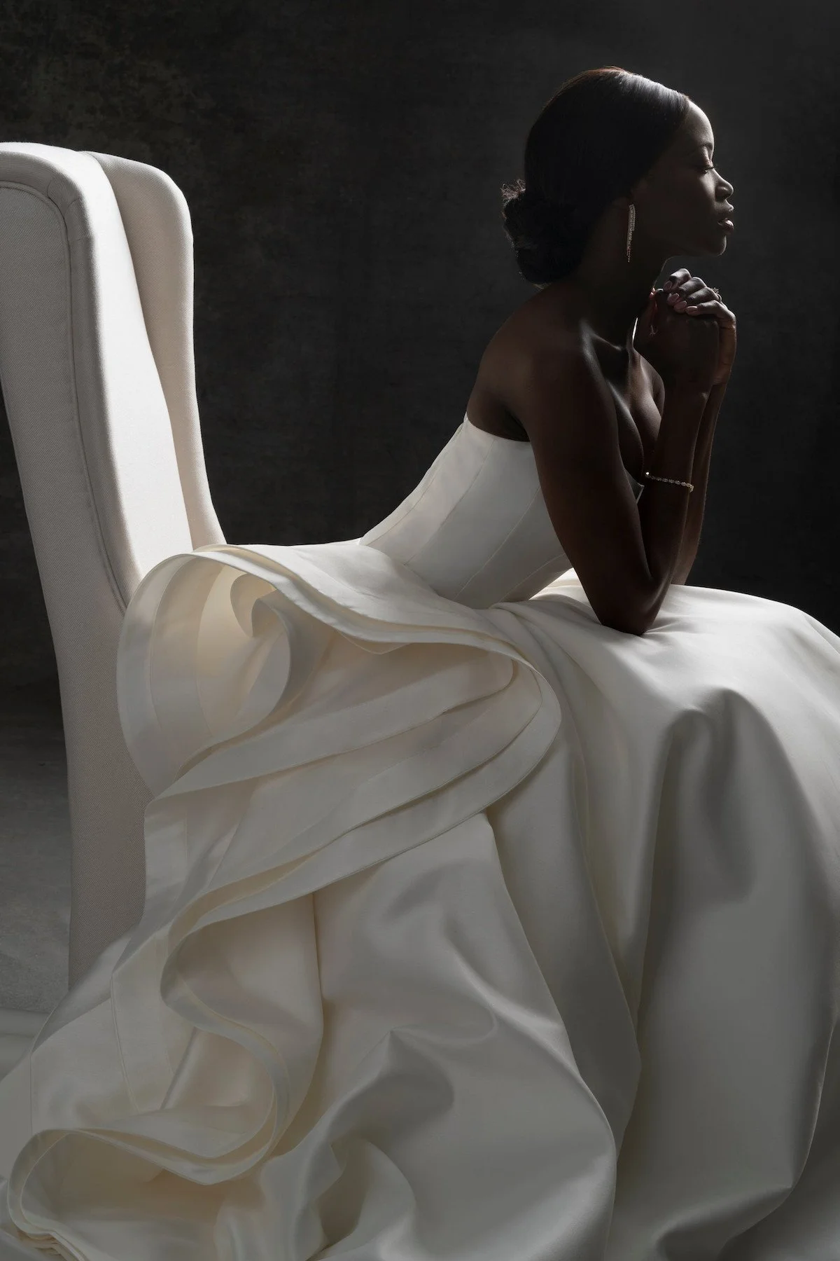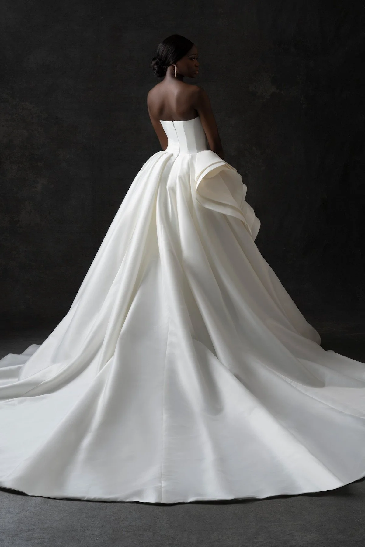 An elegant ruffled flounce softly trails down the side of this strapless Mikado ballgown.
