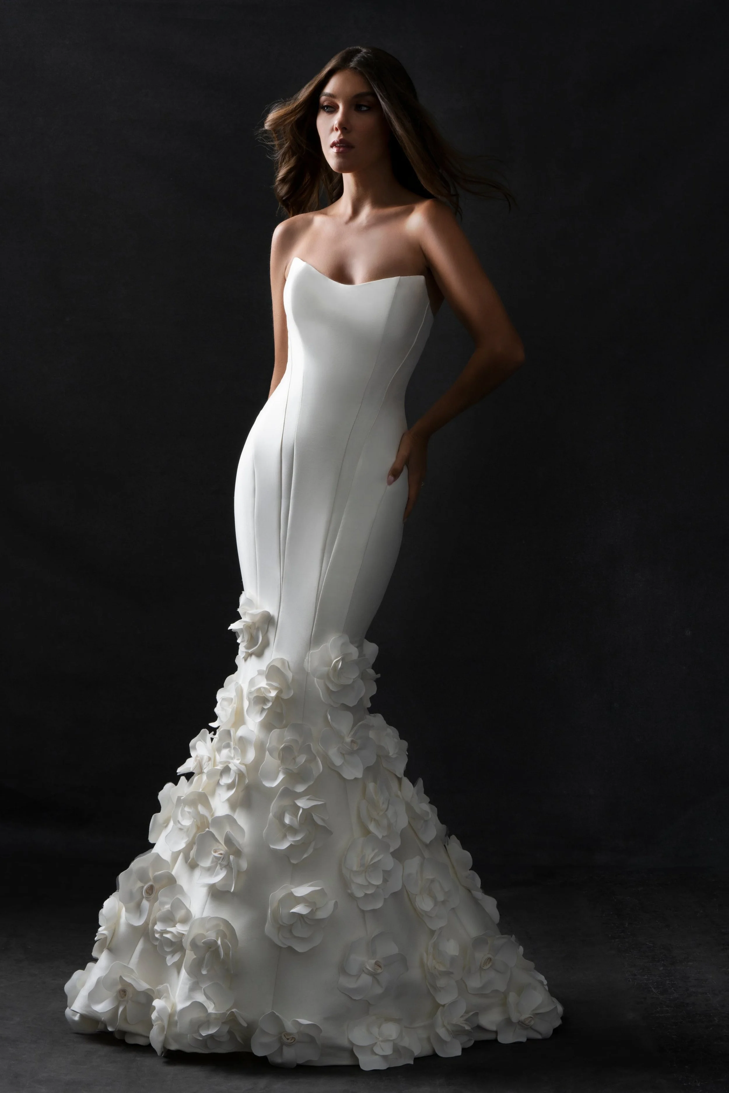 Dimensional gardenia blossoms cascade into a lovely pool at the hem of this strapless stretch Mikado gown.