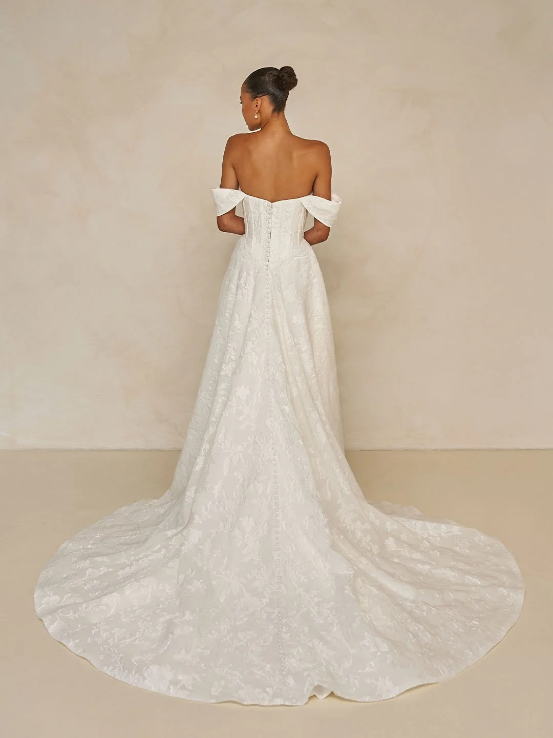 Crafted in floral-printed organza that mimics the depth of embossed texture. The gown boasts a straight, off-the-shoulder neckline framed by soft pleated detailing. Subtly revealing the exposed corset boning beneath for impeccable structure.